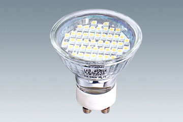SMDs LED lamp with GU10 base, for line voltage 110/240V. With transparent or acid plane glass. Available with warm white, neutral white, daylight or coloured LED.
